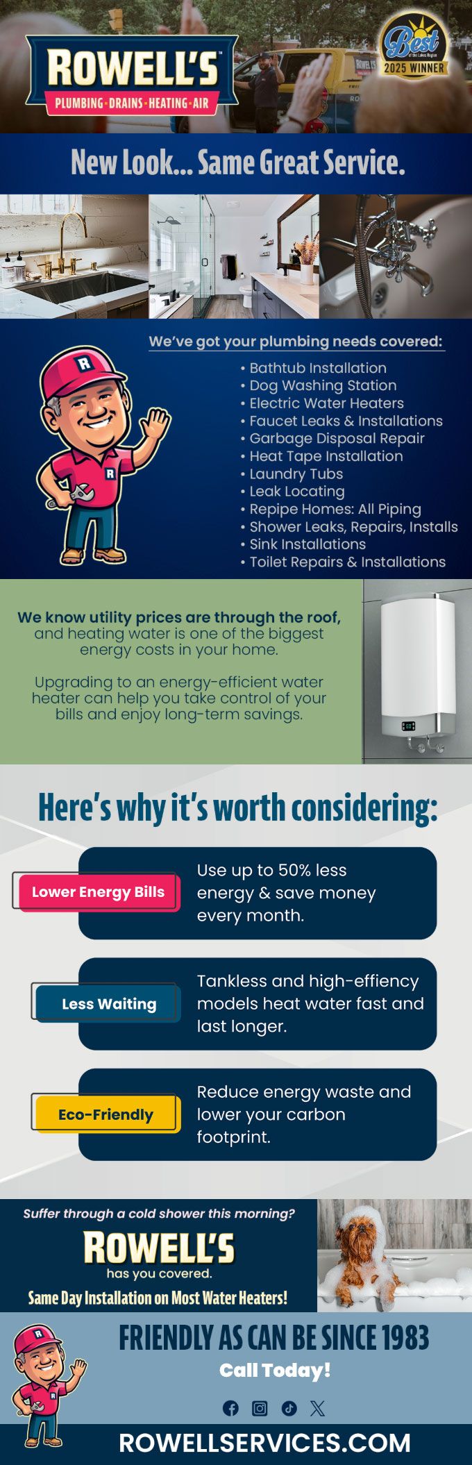 "Friendly As Can Be Since 1983!" When you need help with your plumbing, drains, heating, cooling or electrical in Goffstown, you can always rely on Rowell's Services! Call us now or book online!