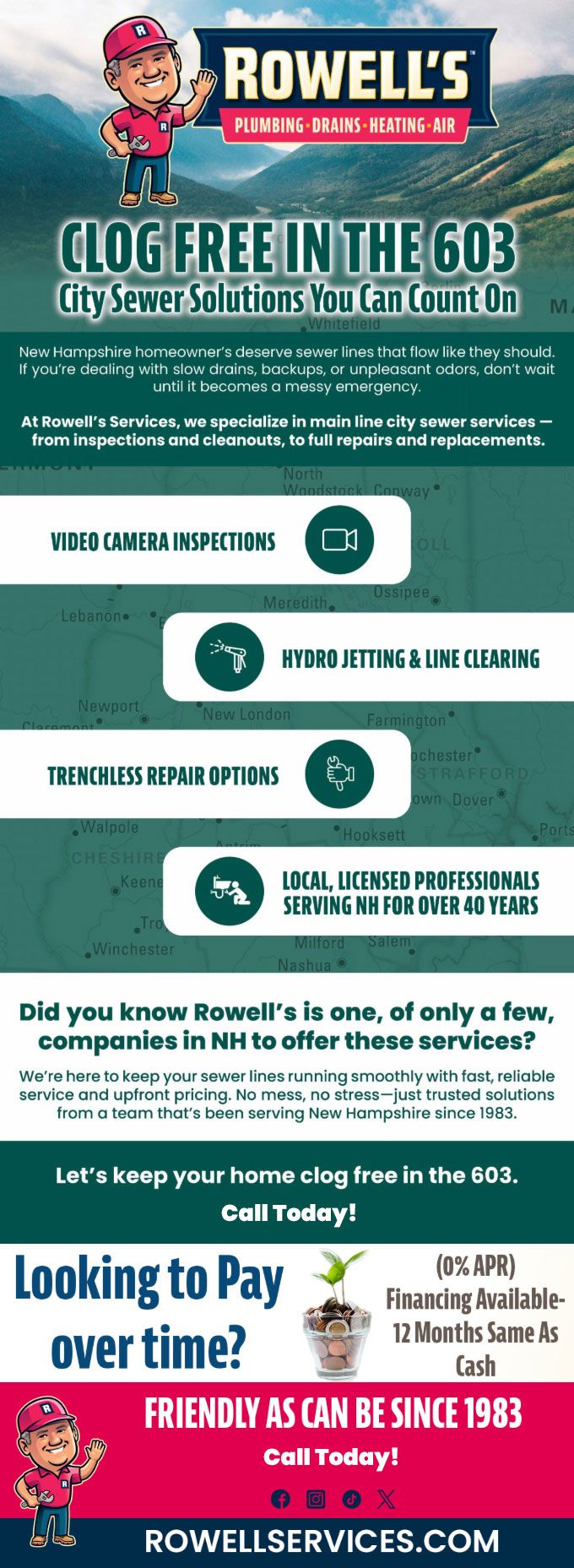 We're here to keep your sewer lines running smoothly with fast, reliable service and upfront pricing. No mess, no stress—just trusted solutions from a team that's been serving Goffstown since 1983.