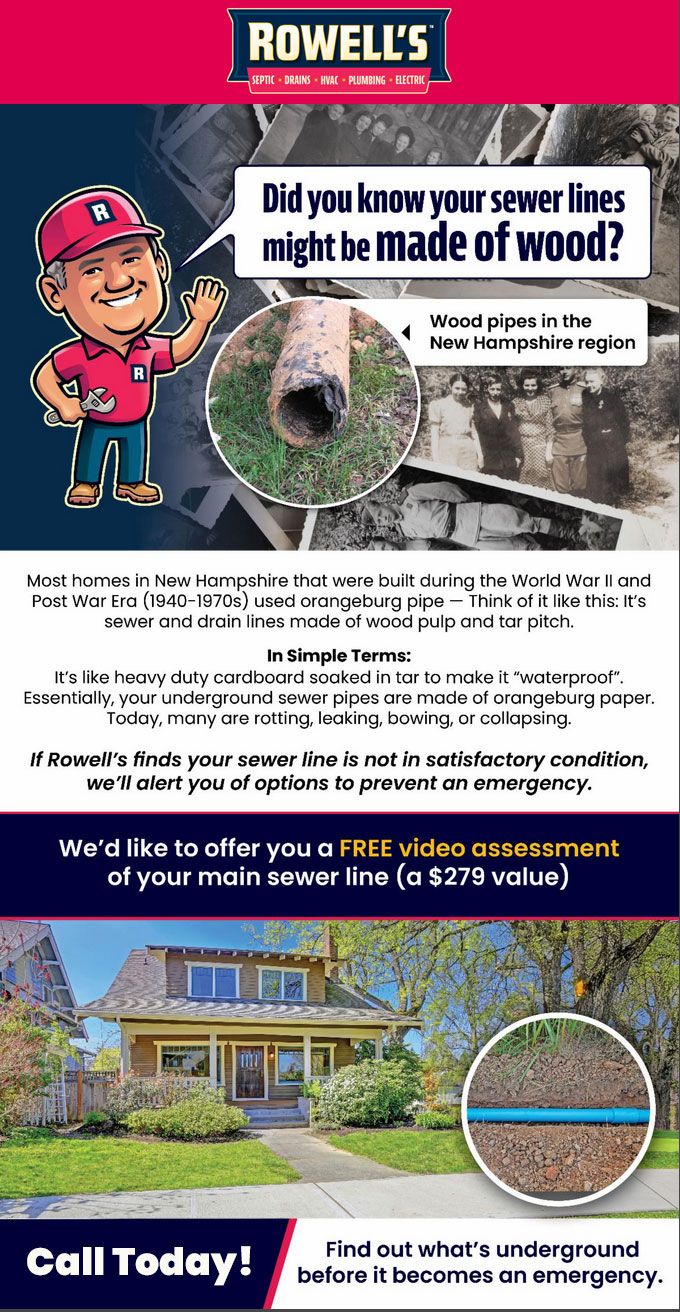 Most homes in Goffstown built during World War II and the post-war era (1940s–1970s) used Orangeburg pipe — sewer and drain lines made of wood pulp and tar pitch.